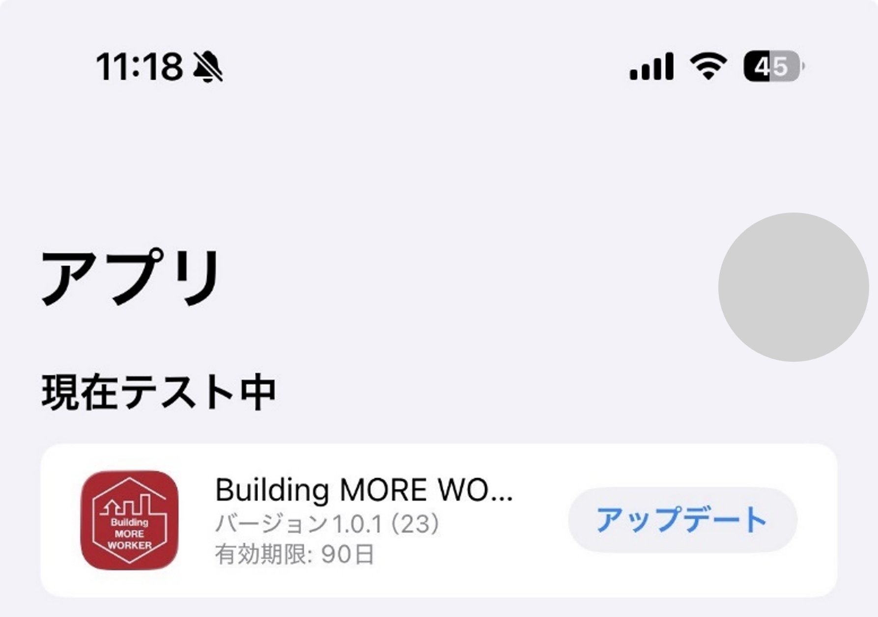 ・TestFlight アプリ内の「現在テスト中」の一覧から 「Building MORE WORKER」アプリ を見つけ、「アップデート」をタップしてください。